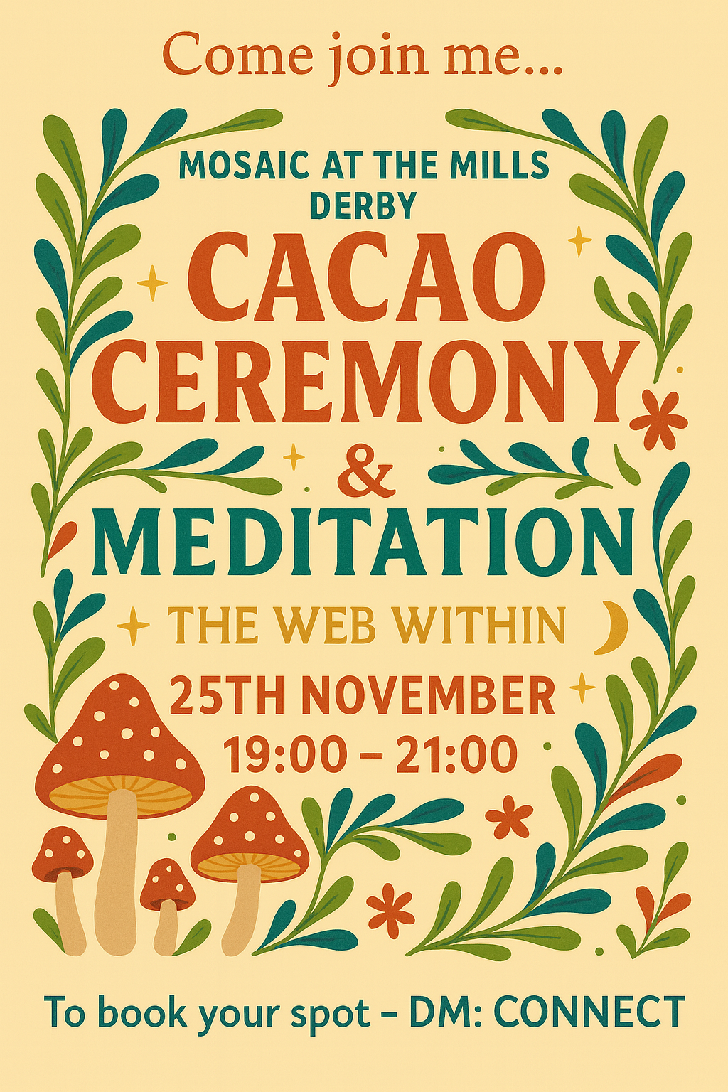 Supported by the heart-opening spirit of ceremonial cacao, we’ll move into The Web Within, a mycelium-inspired meditation exploring connection, rootedness, and the quiet intelligence that flows through body, breath, and being. This 45-minute journey weaves together grounding breathwork, visualisation, and gentle inner exploration, inviting you to soften into presence and feel the threads of connection that sustain you.